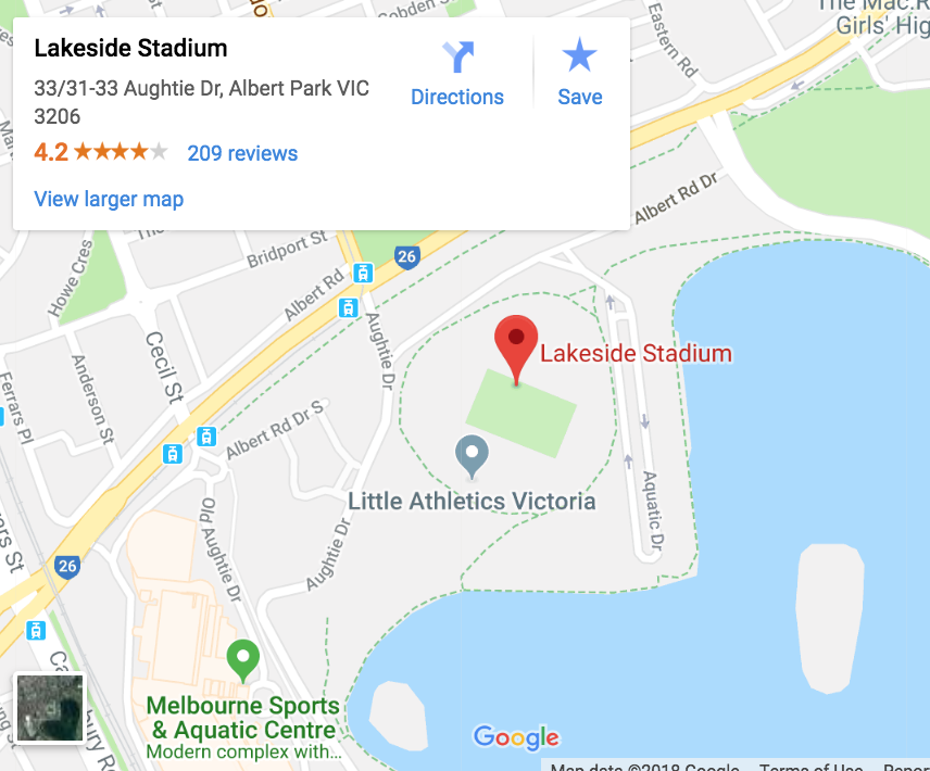 Our home, the State Athletics track at Lakeside Stadium, is located at 31-33 Aughtie Drive Albert Park. Enter through Gate 1 off Albert Road Drive. Parking is available along Albert Road Drive and next to the Stadium (enter Aughtie Drive).